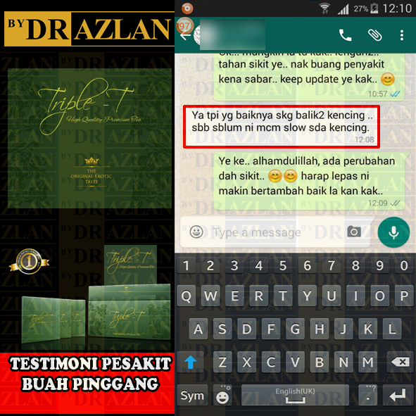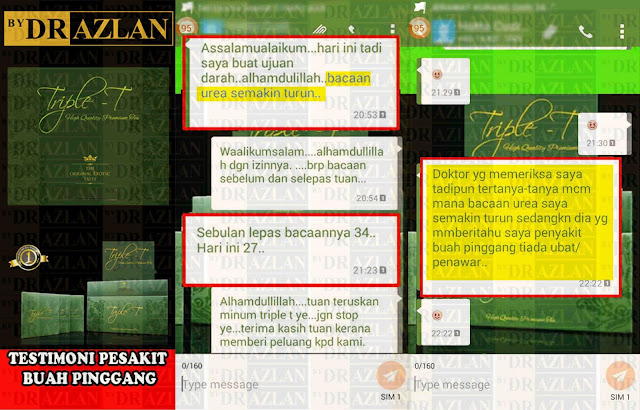 "Alhamdulillah, setelah gunakan penawar atau ubat sakit buah pinggang ini, masalah sakit buah pinggang ini terkawal dengan penurunan kandungan kadar creatine ".